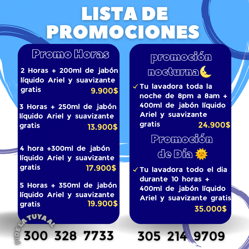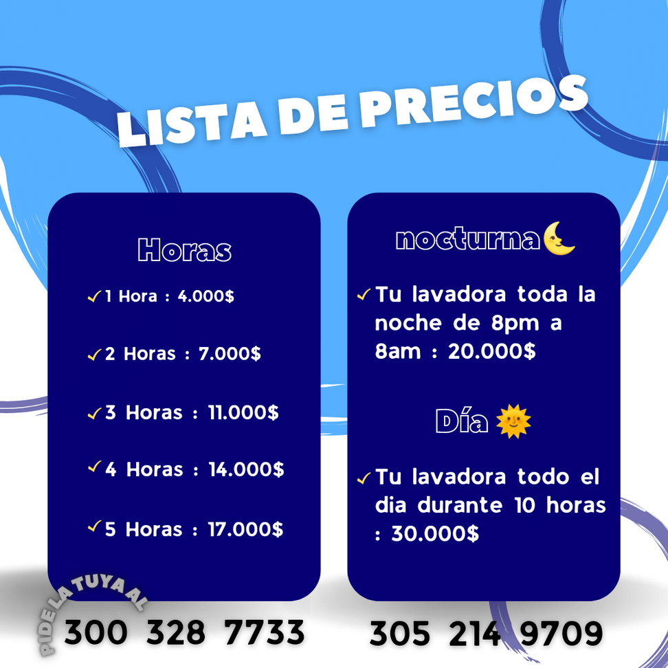 Nuestra lista de precios normales sin jabón ni suavizante .Puedes encontrar servidios por horas. Por todo el día o toda la noche nos ajustamos a tu tiempo